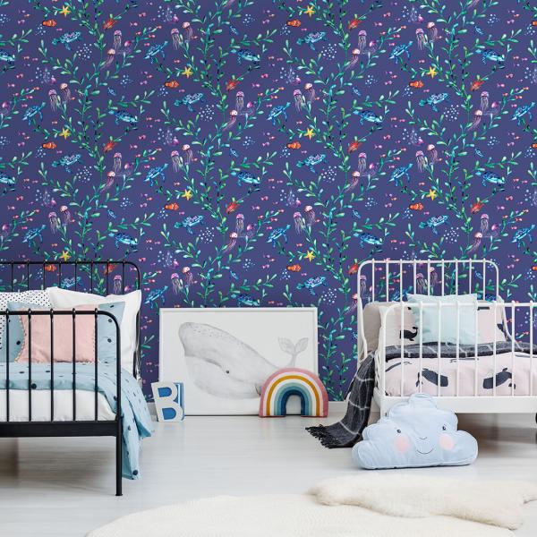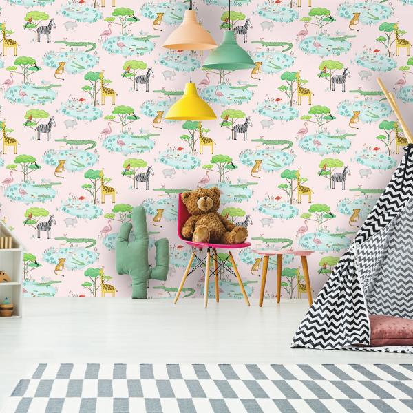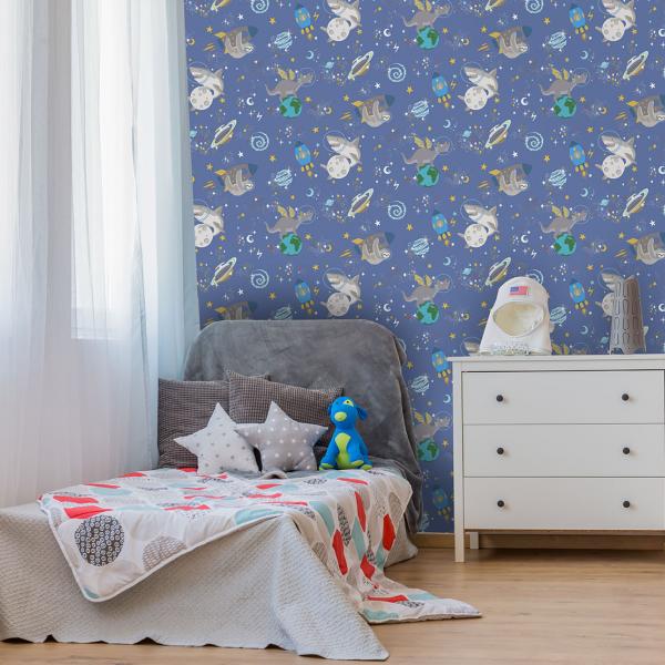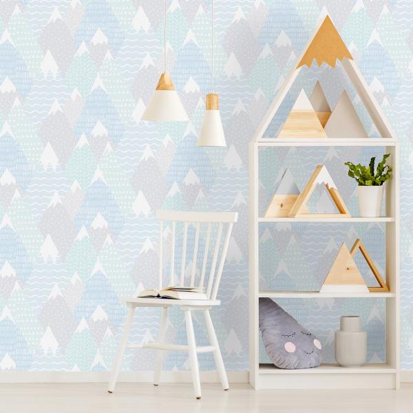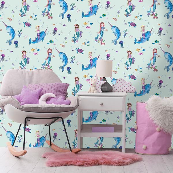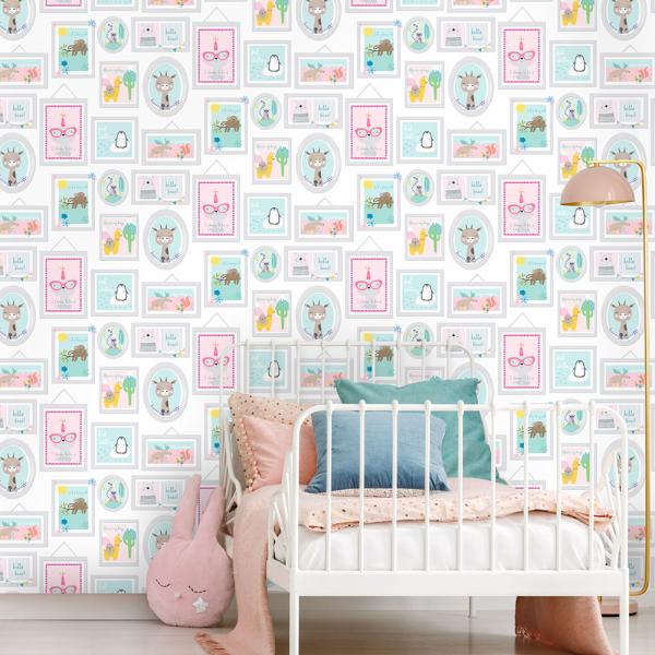 En ljuvlig barnkollektion från våra engelska designers för barn i åldern 0 till skolåldern med gulliga mönster och pastelliga färger. Här finns allt från rymdmotiv, bilar, djungeldjur och dinosaurer till livet under vatten. Flygande enhörningar, regnbågar och molntapeter. Klassiska färger som rosa, ljusblått, grått samt en lite mörkare blå. En serie med glittrande små ”stenar” i mint, rosa eller multifärgat samt några mönster med självlysande effekt. För den lekfulla barnkammaren.