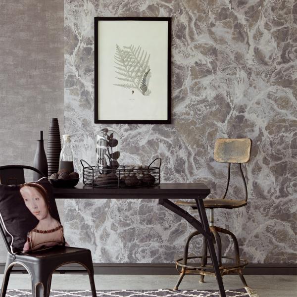 En läcker bok med industriell design och råa material i lyxig känsla. Mönster av polerad marmor, träfiber, grovt linne och naturell bambu blandat med bark från björk eller cypress, oxiderad metall och slitet läder. Färgerna går från grafiskt svart och vitt till himlens blågrå toner, kraftigt brun, subtilt blond, naturligt grönt, frostigt rosa till guld, silver och koppar samt havets lockande turkos toner. Fantastiska tryck i dessa vackra och lyxiga tapeter för den som gillar den industriella trenden.