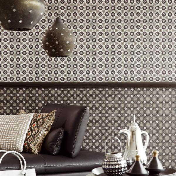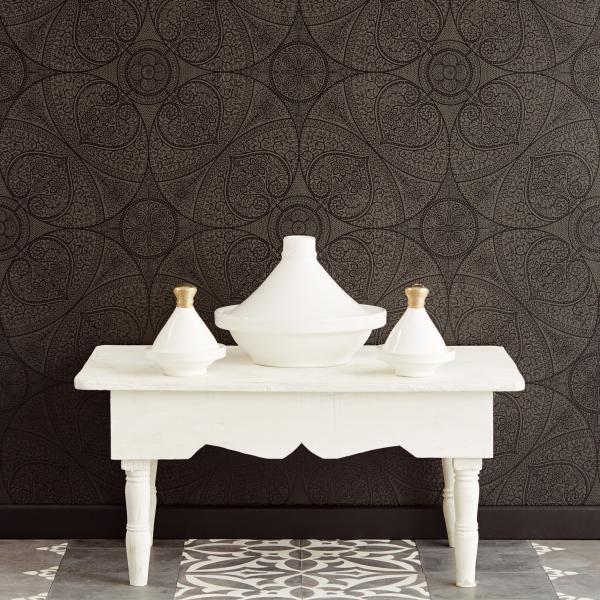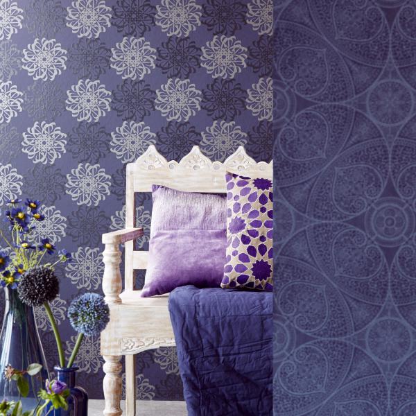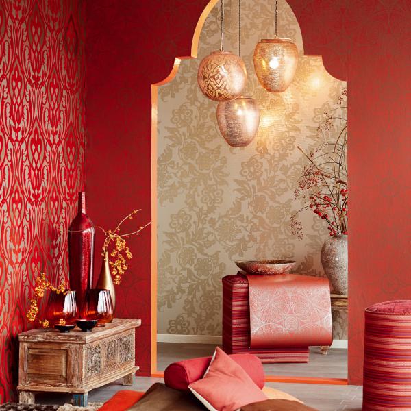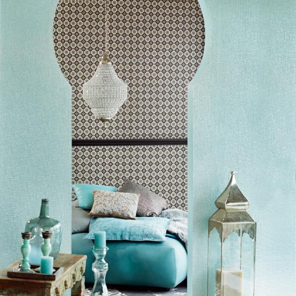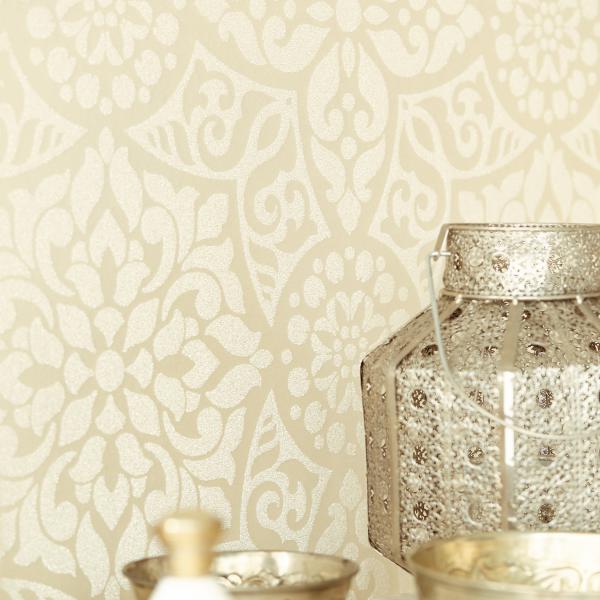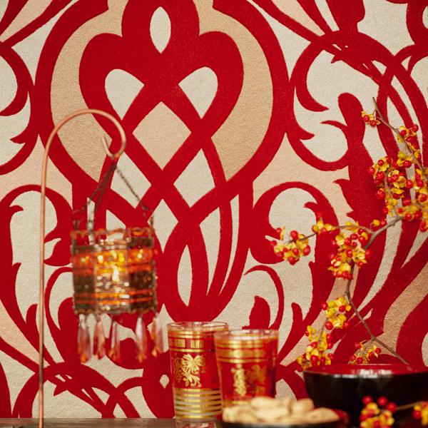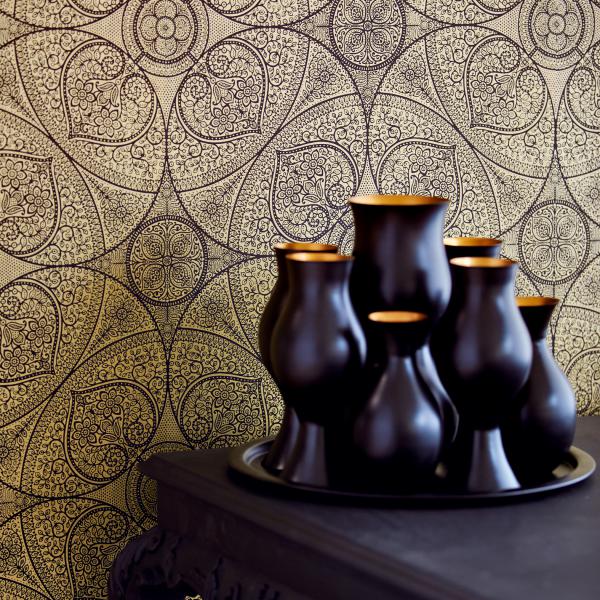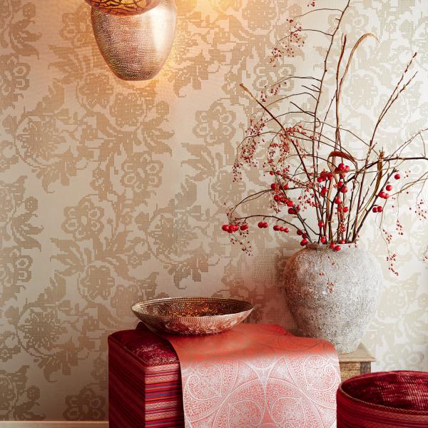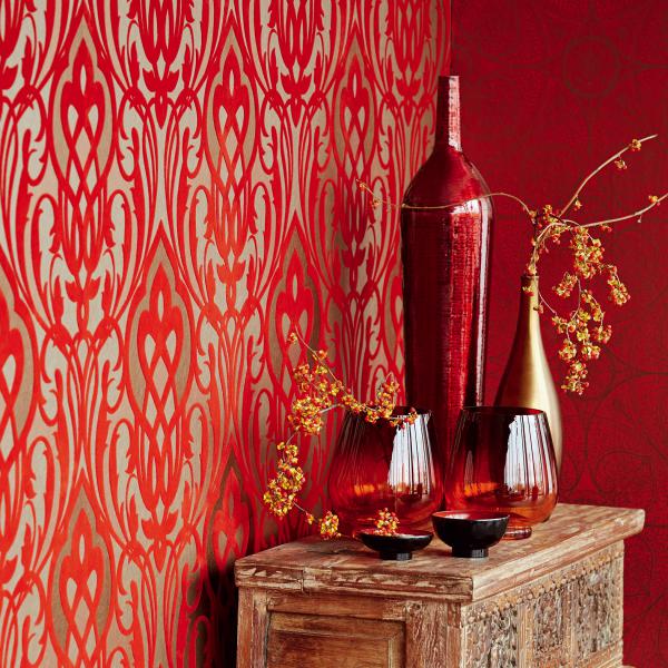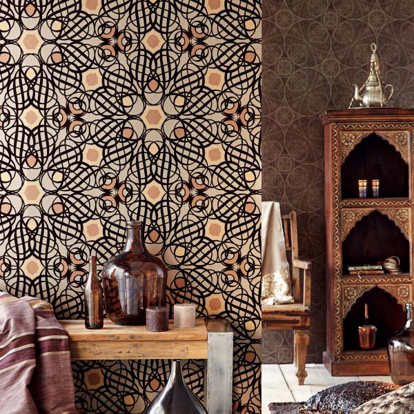 En fantastisk kollektion med inspiration från Orienten på temat ”tusen och en natt”. Stämningsfulla och vackra tapeter i orientaliska mönster på olika ytor. Några med sammet som för tanken till ljuslyktor i färgad glasmosaik, andra med sirligt medaljongmönster med guldtryck på eldigt röd, härligt turkos eller svart botten. En serie eleganta tapeter med glaspärlor fulländar stilen ”tusen och en natt”. Flera fina sidotapeter att matcha till i ljuvliga färger och diskreta mönster. En drömkollektion.