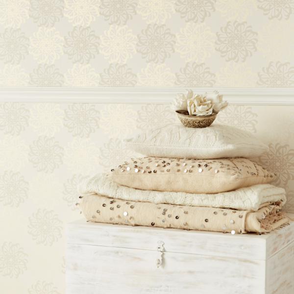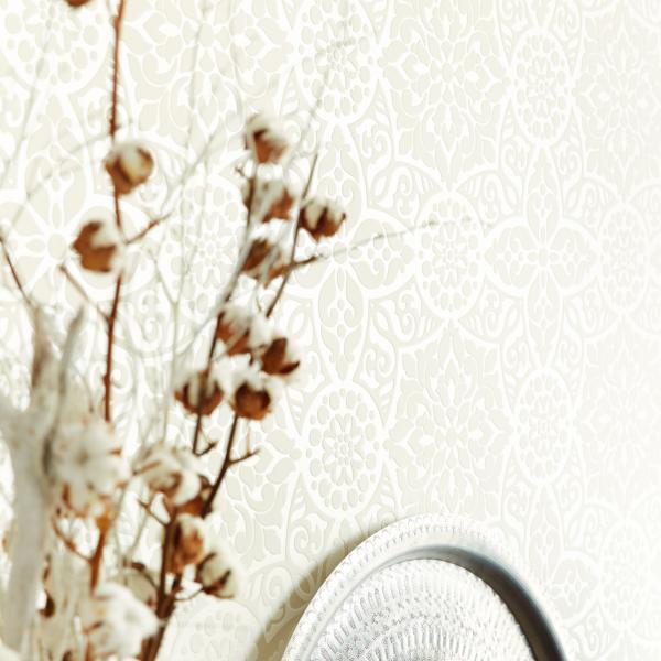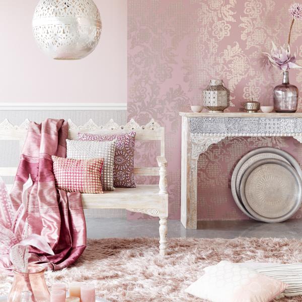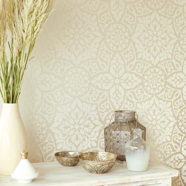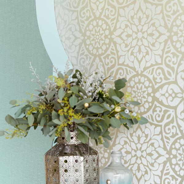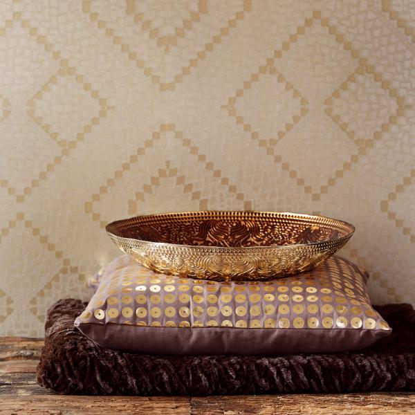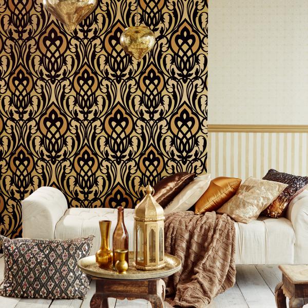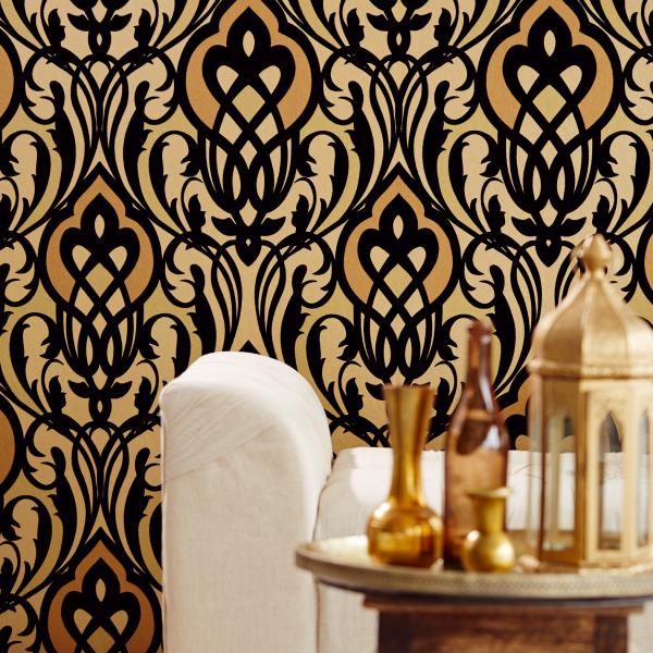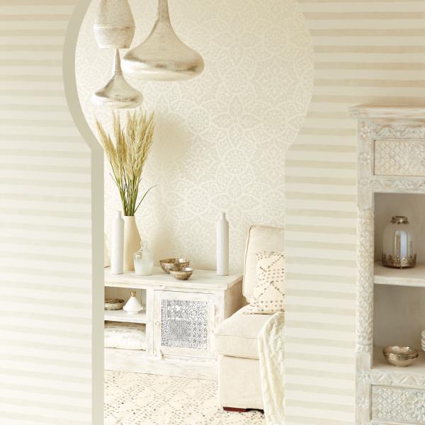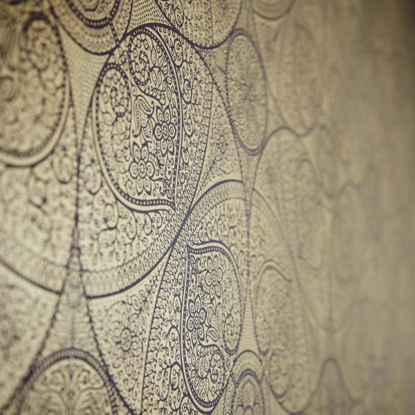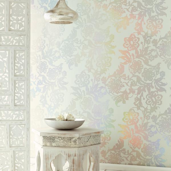 En fantastisk kollektion med inspiration från Orienten på temat ”tusen och en natt”. Stämningsfulla och vackra tapeter i orientaliska mönster på olika ytor. Några med sammet som för tanken till ljuslyktor i färgad glasmosaik, andra med sirligt medaljongmönster med guldtryck på eldigt röd, härligt turkos eller svart botten. En serie eleganta tapeter med glaspärlor fulländar stilen ”tusen och en natt”. Flera fina sidotapeter att matcha till i ljuvliga färger och diskreta mönster. En drömkollektion.